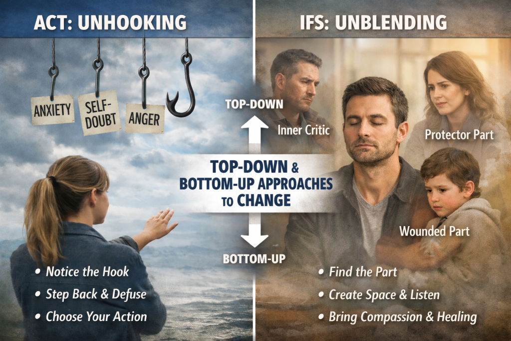 ACT’s hooks metaphor and IFS unblending are not competing ideas; they are complementary lenses on the same human process. One emphasizes stepping back so we can choose differently. The other emphasizes turning toward so the system no longer needs to react the same way.